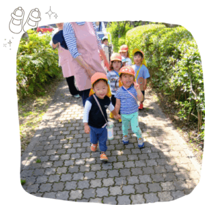 ベリーキッズでは毎日朝の会の後、外へ散歩に出かけます。2歳児になると、少し遠い公園や参道に出かける機会を作り、たくさん歩きます。